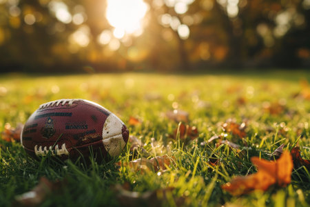 Fall season football background image. The perfect symbols of Autumn, fallen leaves and American Football. The ball sitting on the grass on a crisp fall day