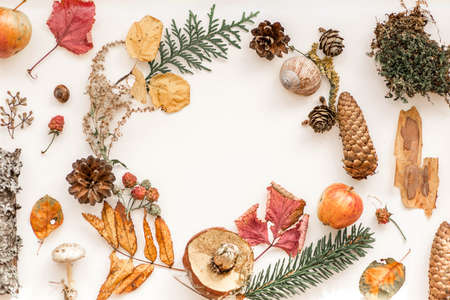 Top view image of autumn forest natural composition over wooden white background .Flat lay. Banner