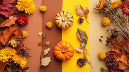 Composition of autumn leaves, pumpkins, flowers for Thanksgiving, Halloween. Studio Photo