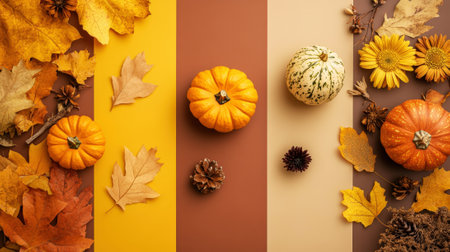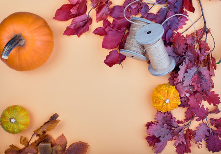 Multicolored leaves pumpkins and spices. Creative autumn layout.