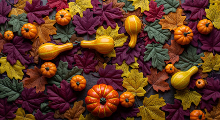 A top-down view of an autumn harvest arrangement featuring various pumpkins, gourds, and vibrantly colored fall leaves scattered across a wooden surface. The scene evokes a sense of seasonal abundance and festive decoration.