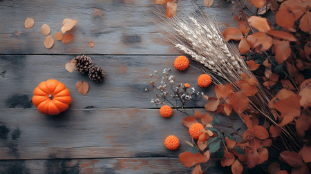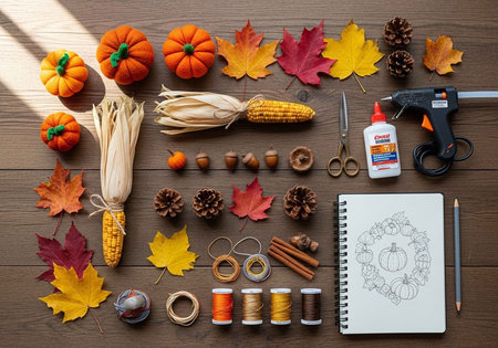 A collection of autumn crafting supplies arranged on a wooden table
