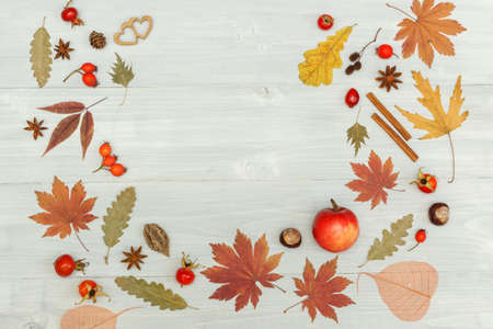 Autumn pattern frame of dried leaves, rosehip berries, anise, cinnamon and two small wooden hearts. Top view On a light wooden background, with space.