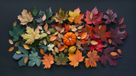 A top view of autumn maple leaves with pumpkin on a black wooden surface- thanksgiving day concept