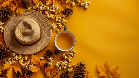 Flat Lay Autumn background decoration from dry leaves, straw hat and pumpkin on wooden background. Top view for Autumn, fall, Thanksgiving concept.