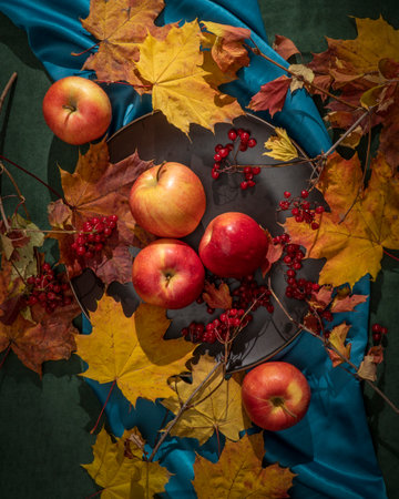 Autumn scene featuring fresh apples on a dark plate surrounded by colorful leaves, blue fabric, and red berries. Evokes fall mood, seasonal harvest, and cozy, natural still-life themes.