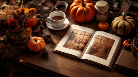Autumn composition with plaid, pumpkins, tea and book on white background