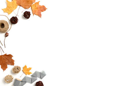 Border frame made from dry leaves and roses, rattan balls, ribbons, twine on white background