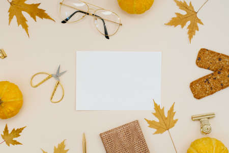 Yellow maple leaves and pumpkins, cookies, scissors, notepad, glasses, pen, clips, on a light beige background with copy space. Flat lay, top view. Work office desk with autumn blogger or freelance decor