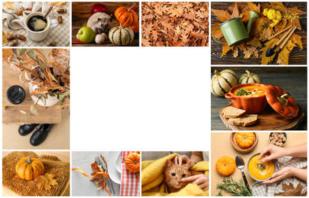 Autumn collage with fallen leaves, cute animals, pumpkins and space for text