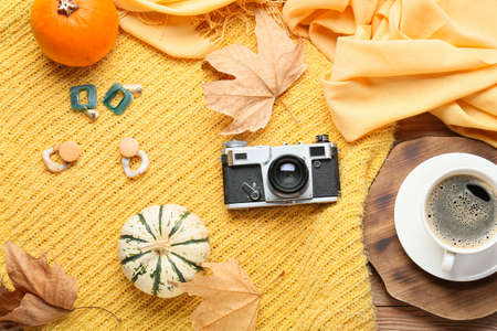 Fall seasonal walking leisure background with autumn leaves, sunflower flowers, pumpkins, warm blanket, hat, knitted bag, coffee cup, photo camera. Comfortable autumn leisure background