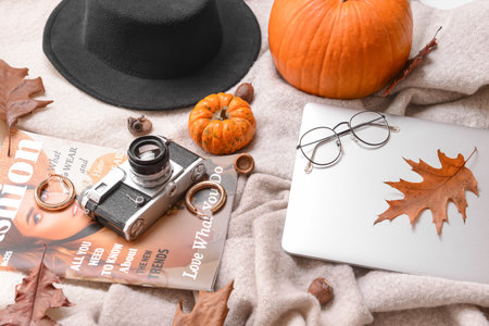 Autumn composition with stylish clothes, laptop, magazine and photo camera