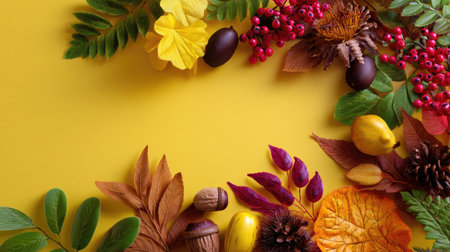 autumn leaves with yellow flowers, a pineapple and acorn