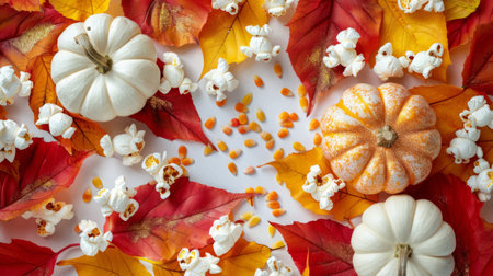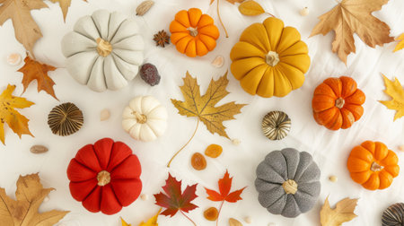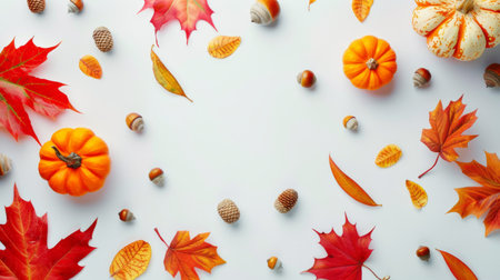 Orange, brown white Fall background. Top view on white textile. Abstract geometric diagonal pattern with pumpkins, acorns, nuts, Autumn leaves and wattle balls.