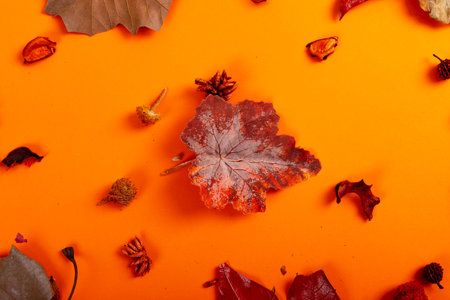 Composition of halloween decoration with dry leaves and seeds on orange background. horror, fright, halloween tradition and celebration concept digitally generated image.