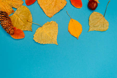Autumn frame of maple leaves, oak, acorns and pumpkins on a blue background. Flat lay, top view, place for text
