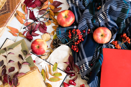 Autumn background with book, leaves, sweater, candle, scarf and glasses. Flat lay hygge composition for cozy fall atmosphere. Space