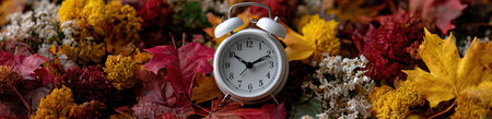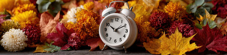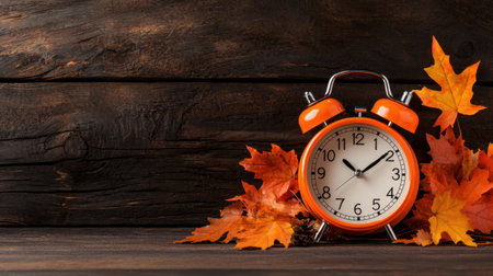Daylight savings time in autumn fall, retro alarm clock on a wooden background with orange leaves, web banner