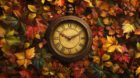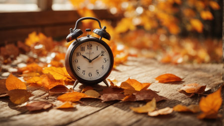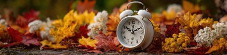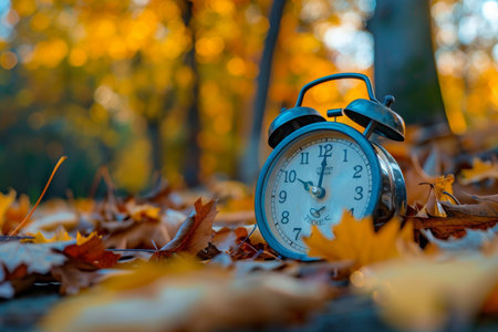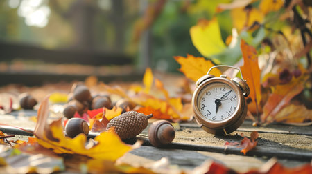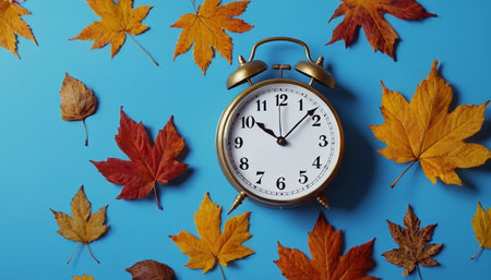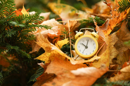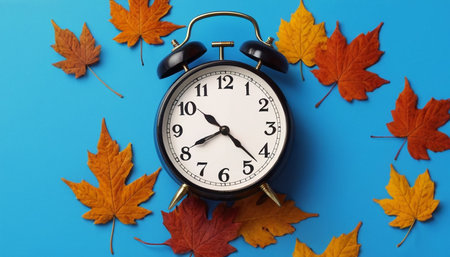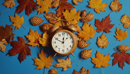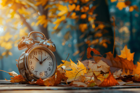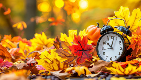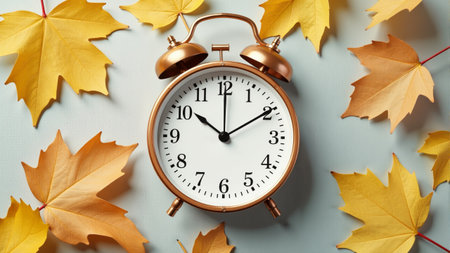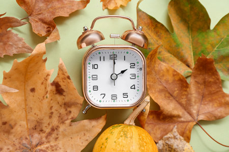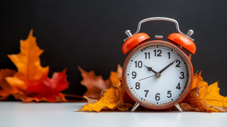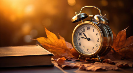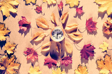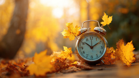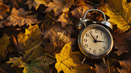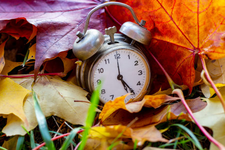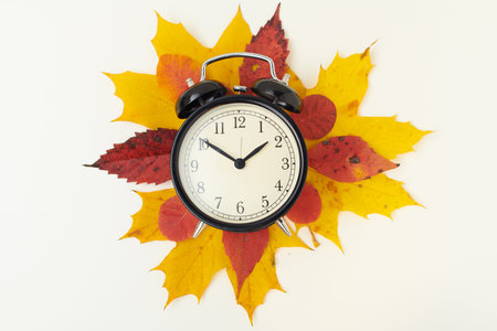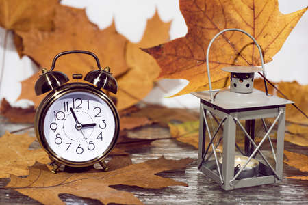 Autumn time change with fall leaves, alarm clock, daylight saving time in high quality image