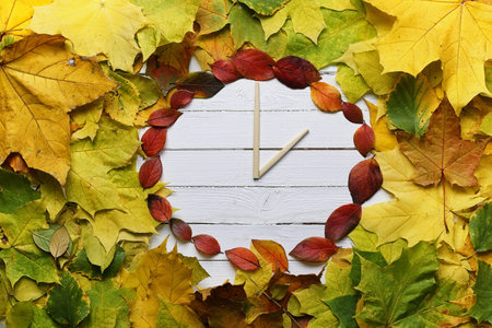 Empty space for copy with alarm clock and maple leaves border frame on wooden background