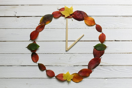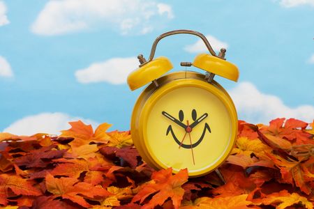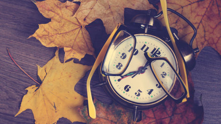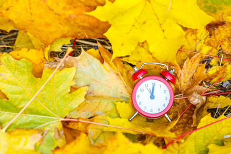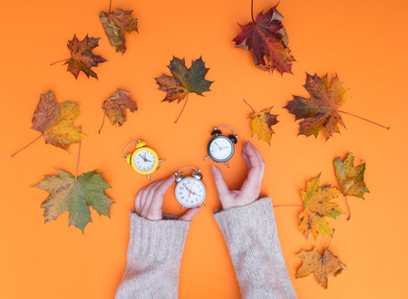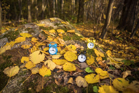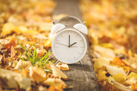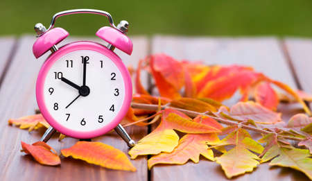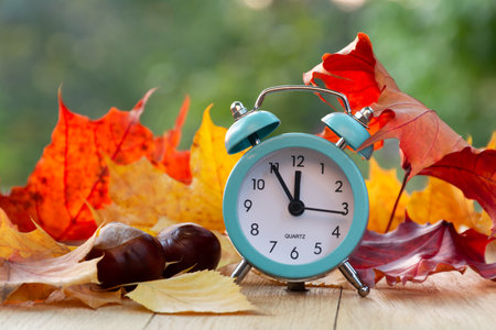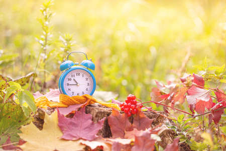 Winter time changeover, end of daylight saving time in autumn, alarm clock fall back switch, colorful foliage, change season