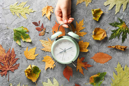Female hand holds alarm clock on gray textured background with Autumn leaves