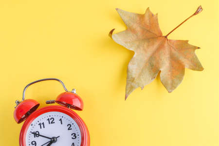 Red alarm clock and dry autumn leaf on yellow.