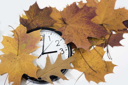 Alarm clock on white background and autumn leaves of different colors..