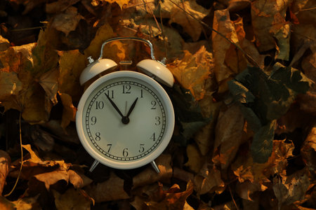 Autumn season time, retro vintage alarm clock in dry fall leaves - daylight saving time concept
