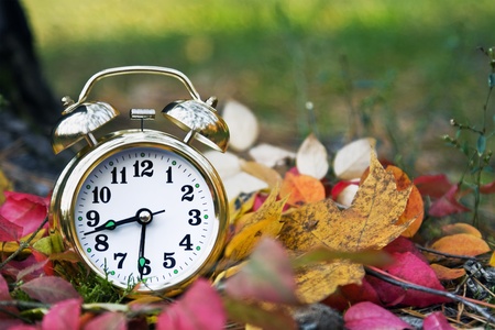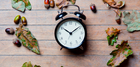 Alarm clock with autumn foliage, end of daylight saving time in fall, winter time changeover
