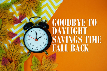 Goodbye To Daylight Savings Time Fall Back with alarm clock and maple leaf decorations on orange background