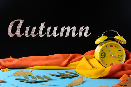Alarm clock near a black school board, autumn leaves, scarf and an inscription Autumn