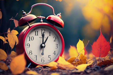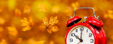Retro red alarm clock with autumn leaves, daylight savings time banner