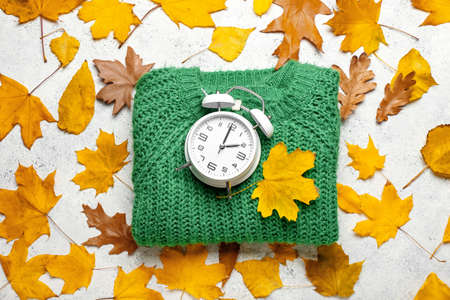 Alarm clock, sweater and autumn leaves on light background