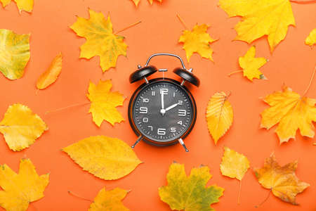 Alarm clock and autumn leaves on color background. daylight saving time end