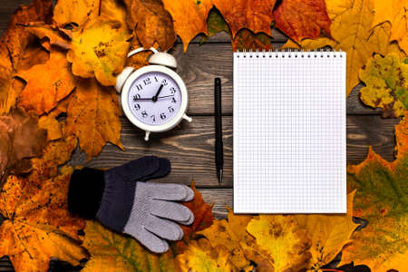 Notepad with a pen and alarm clock, autumn leaves and knitted gloves on a brown wooden table
