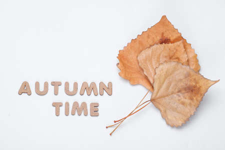Autumn time. Three dried fallen leaves of poplar on a white background