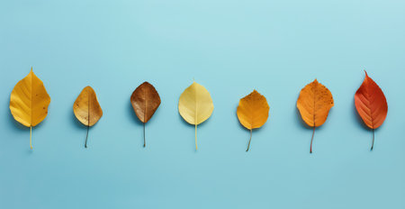 A collection of autumn leaves arranged in a row on a bright blue background, showing the diverse and vibrant colors of fall. Perfect for seasonal themes and nature-related concepts.