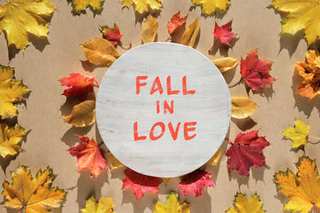 Autumn writing word arranged by autumn leaves and red berries. Seasonal floral fall decoration. Colorful wooden letters