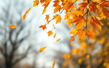 Colorful autumn leaves gently falling from branches in a serene park during midday