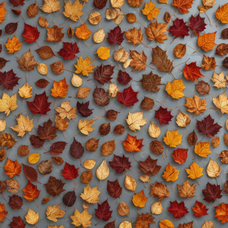 A collection of autumn leaves in shades of red, yellow, and orange, artfully arranged on a gray backdrop, capturing the beauty of the fall season in a simple yet elegant manner. AI generated image