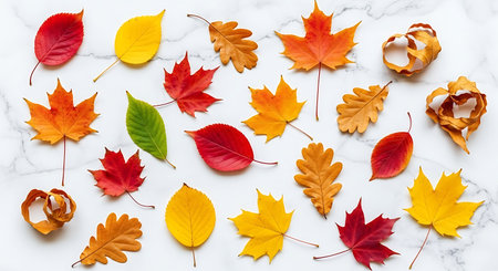 Colorful autumn leaves on white marble background. Flat lay, top view