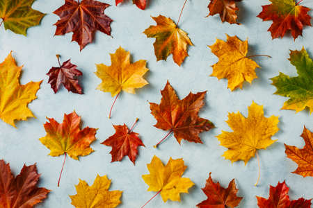 Colorful maple leaves on a blue background
