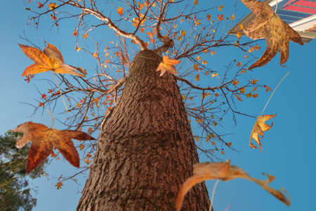Autumn scene, the falling color leaves of a maple tree, selective focus
