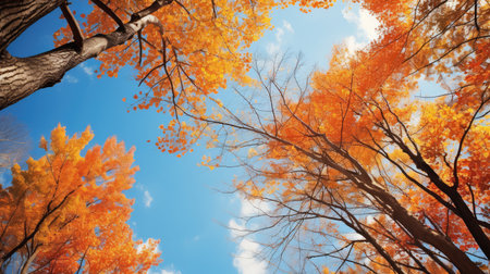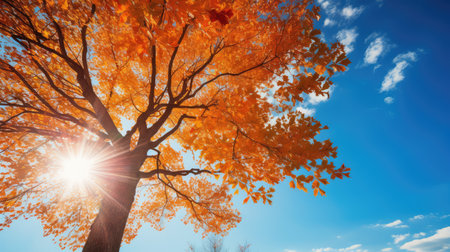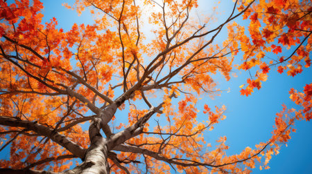 Capturing a low angle view of a majestic tree adorned with vibrant orange leaves, set against a clear blue sky, showcases the breathtaking beauty of autumns natural spectacle