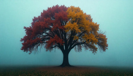 Two-toned tree in misty landscape with fall foliage