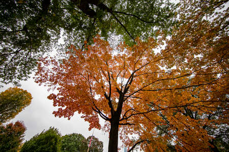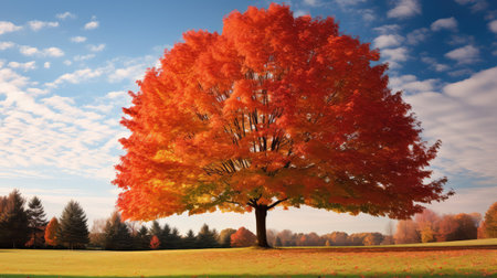 Vibrant orange maple tree in autumn season parkland