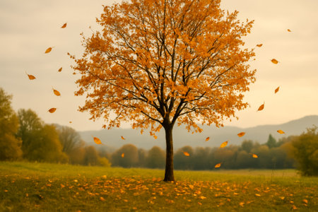 A beautiful autumn tree surrounded by swirling orange leaves in a serene landscape