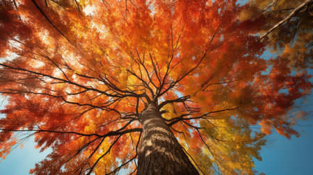 Low angle view of a majestic tree with vibrant orange and red autumn leaves, its branches reaching towards the sky on a beautiful fall day, creating a stunning natural spectacle