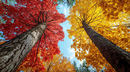 upward view of two tall trees with leaves in the vibrant colors of autumn, AI generated image